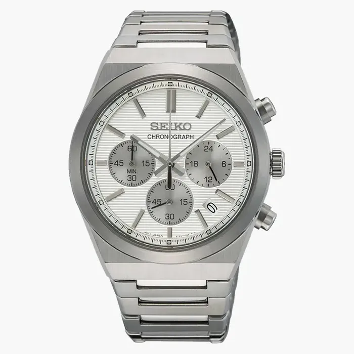 SEIKO SSB451 שעון סייקו כרונוגרף בעיצוב ספורטיבי. לשעון מנגנון קוורץ 8T63 . לוח השעון בגוון לבן עם טקסטורת פסים אנכיים, הכולל תאריכון וכרונוגרף המודד עד 60 דקות ביחידות של חמישית שנייה