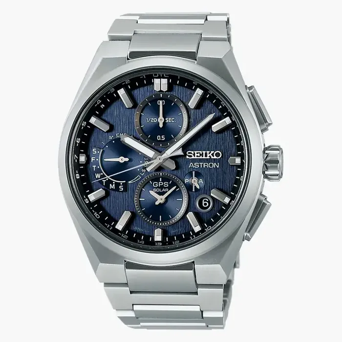 SEIKO Astron TITANIUM שעון היד המופעל על ידי אנרגיית השמש של אסטרון מסמל את רוח החדשנות של סייקו שהייתה קיימת מראשית המותג בשנת 1881. מתחת לזכוכית ספיר קריסטל, מצוי לוח כחול עם גימור קו שחור.